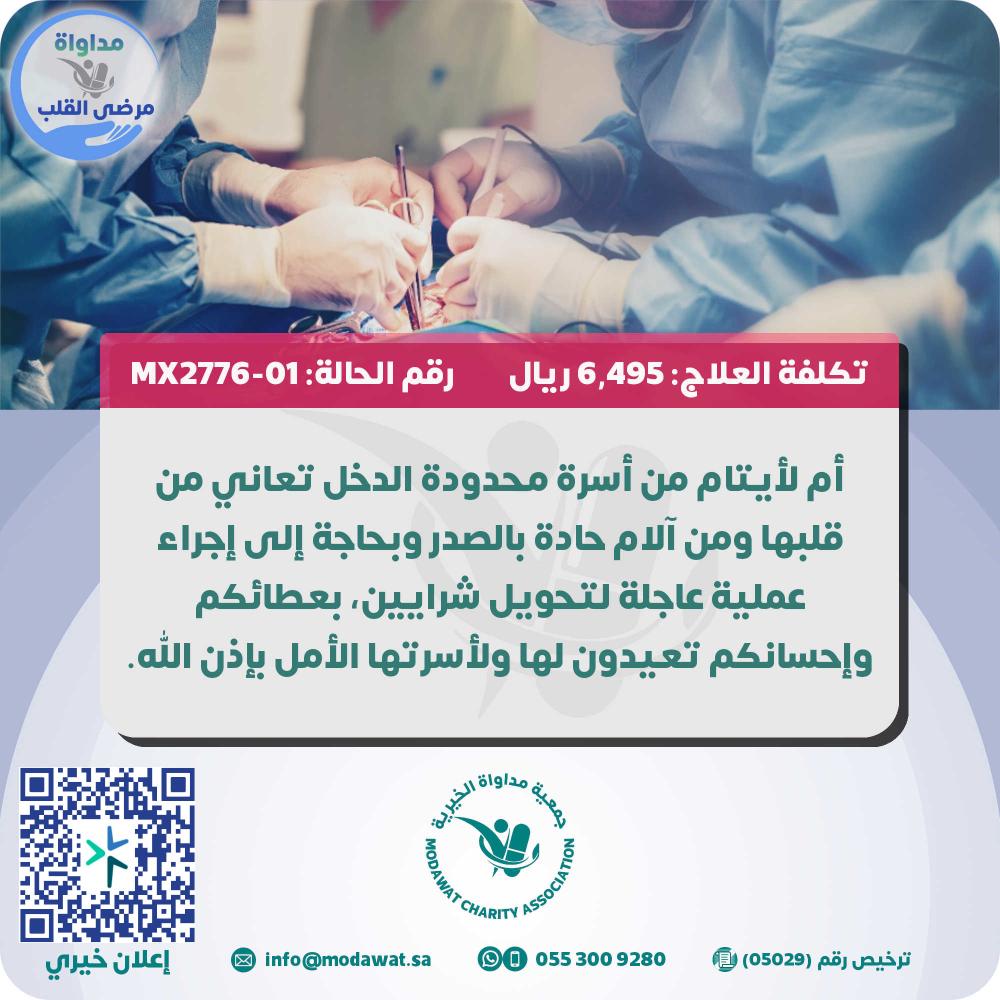 أم لأيتام من أسرة محدودة الدخل تعاني من قلبها ومن آلام حادة بالصدر وبحاجة إلى إجراء عملية عاجلة لتحويل شرايين، بعطائكم وإحسانكم تعيدون لها ولأسرتها الأمل بإذن الله.